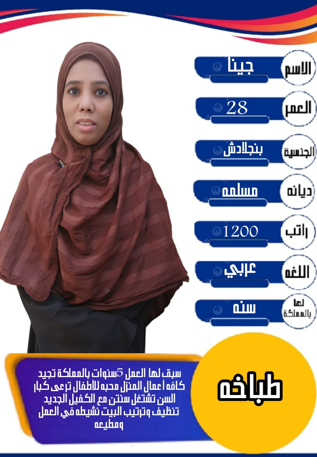 ✨✨بنجلاديشه طباااااخه✨✨ الاسم…. جينا….. عمرها28…..الجنسيه بنجلاديشه…… مسلمه…… راتبها1200…..اللغه عربي…….لها سنه في المملكه……. ✨✨طبااااااخه ✨✨ سبق لها العمل 5 سنوات بالمملكة…… تجيد كافه اعمال المنزل….. محبه للأطفال ترعى كبار السن….. تشتغل سنتن مع الكفيل الجديد…… تنظيف وترتيب البيت نشيطه في العمل ومطيعه…… ✨✨للتواصل والاستفسار 0543944062