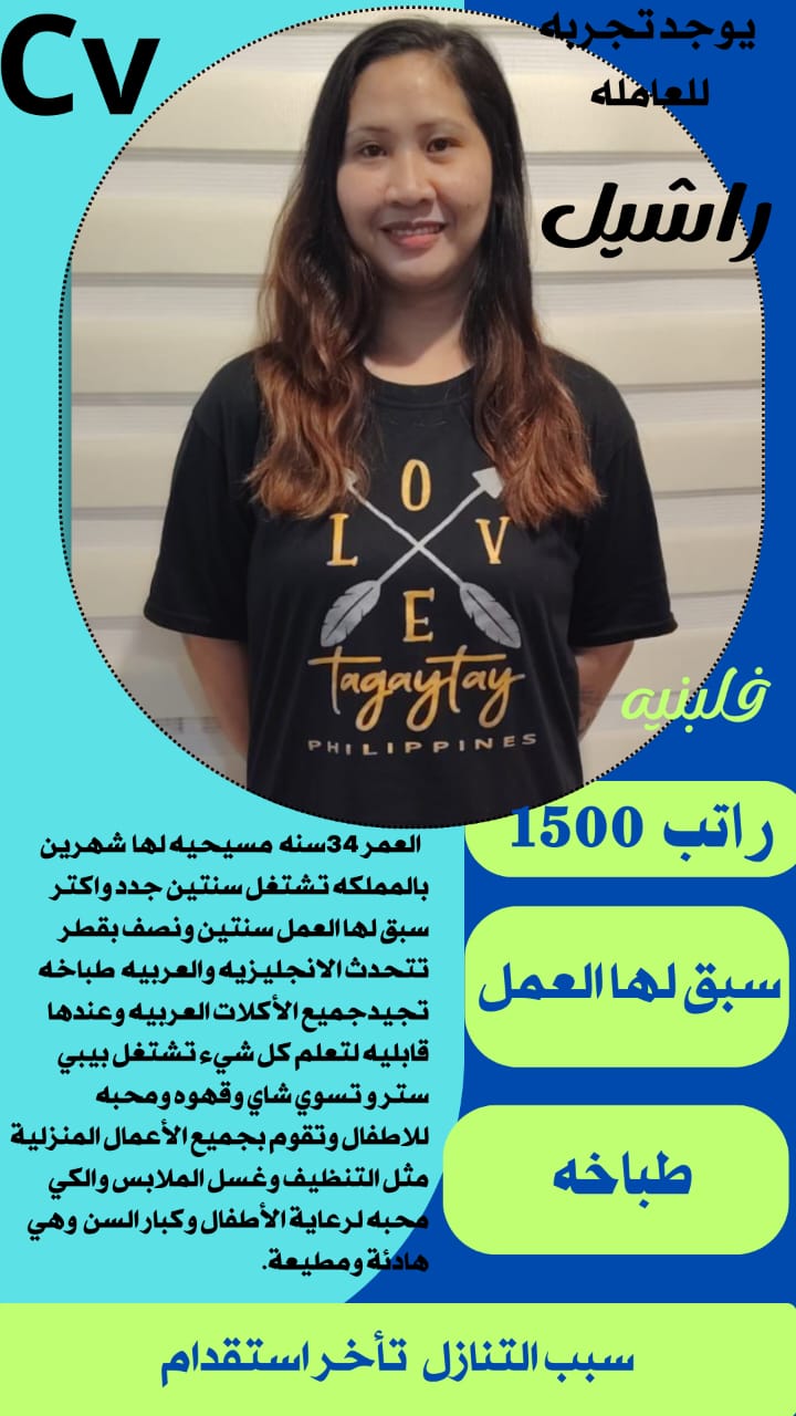 🌺فلبينيه طباخه 🌺 راشيل 🦋العمر 34 سنه🦋 مسيحيه🦋 لها شهرين بالمملكه🦋 تشتغل سنتين بعقد جديدواكثر🦋 سبق لها العمل سنتين ونصف بقطر 🦋تتحدث الانجليزيه والعربيه🦋 🌺طباخه🌺 تجيد جميع الأكلات العربيه 🦋وعندها قابليه لتعلم كل شيء 🦋تشتغل بيبي ستر 🦋و تسوي شاي وقهوه🦋 ومحبه للاطفال🦋 وتقوم بجميع الأعمال المنزلية🦋 مثل التنظيف وغسل الملابس والكي 🦋محبه لرعاية الأطفال وكبار السن 🦋 هادئة ومطيعة.🦋 سبب التنازل تأخر استقدام🦋 🌺🦋للتواصل والاستفسار 0543944062