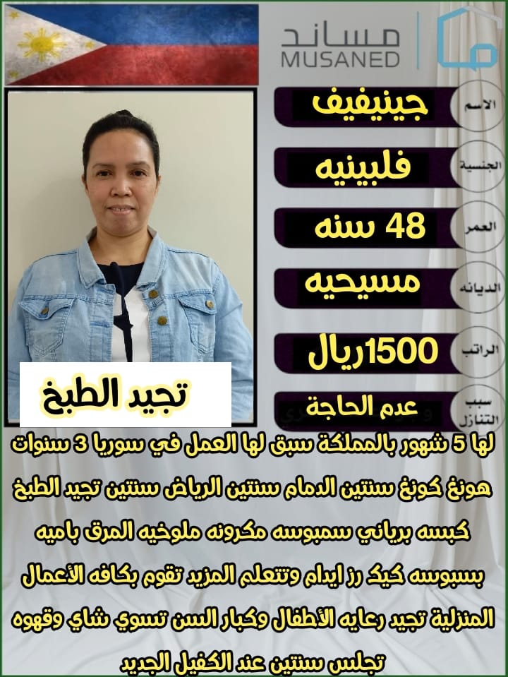 💐فلبينيه تجيد الطبخ 💐 الاسم… جينيفيف….. فلبينيه….. عمرها48…. مسيحيه….. راتبها1500…. سبب التنازل….. عدم الحاجه 💐تجيد الطبخ💐 لها 5 شهور بالمملكة….. سبق لها العمل في سوريا 3 سنوات…. هونغ كونغ سنتين الدمام….. سنتين الرياض…. سنتين تجيد الطبخ……. كبسه برياني سمبوسه مكرونه ملوخيه المرق باميه بسبوسه کیک رز ایدام…….. وتتعلم المزيد تقوم بكافه….. الأعمال المنزلية تجيد رعايه الأطفال…… وكبار السن…. تسوي شاي وقهوه……. تجلس سنتين عند الكفيل الجديد…… 💐💐للتواصل والاستفسار 0543944062