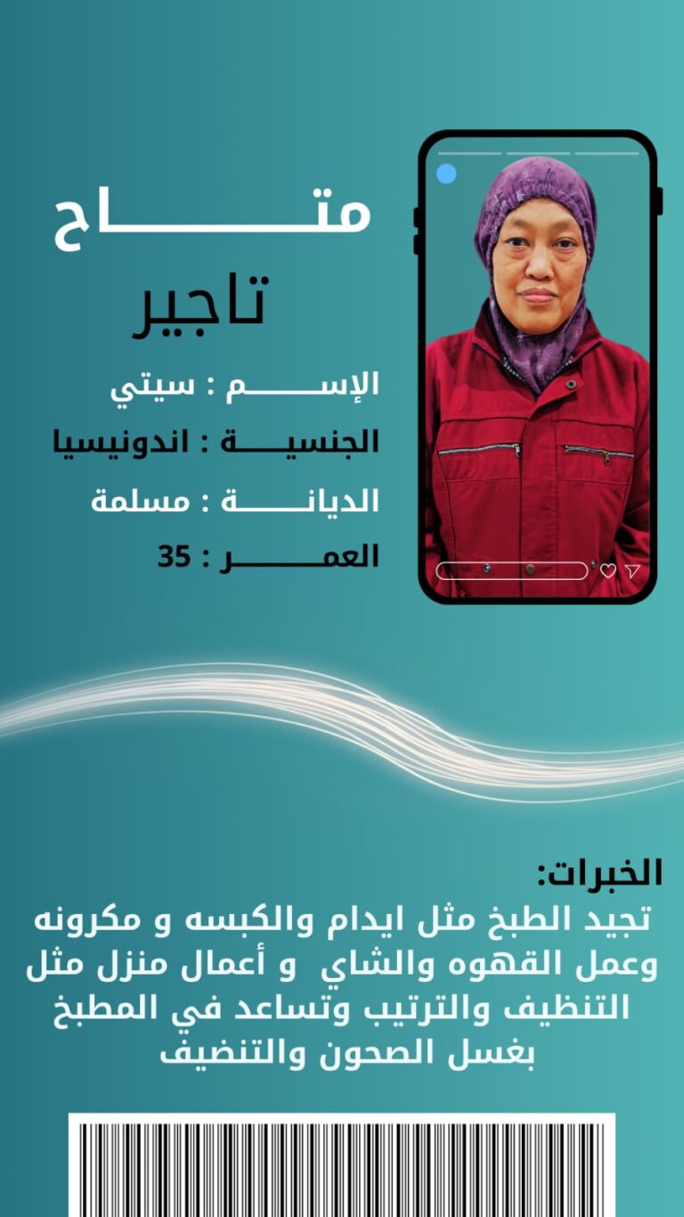 خادمات للتنازليوجد لدينا ومطلوب خادمات للتنازل عاملات للتنازل شغالات للتنازل طباخات كوافيرات مربيات أطفال من جميع الجنسيات للتواصل بنا علي مدار الساعه 0538095298Sama Office for the Transfer of Maidsديسمبر 20, 2025عرض الإعلانيوجد لدينا ومطلوب خادمات للتنازل عاملات للتنازل شغالات للتنازل طباخات كوافيرات مربيات أطفال من جميع الجنسيات للتواصل بنا علي مدار الساعه 0538095298