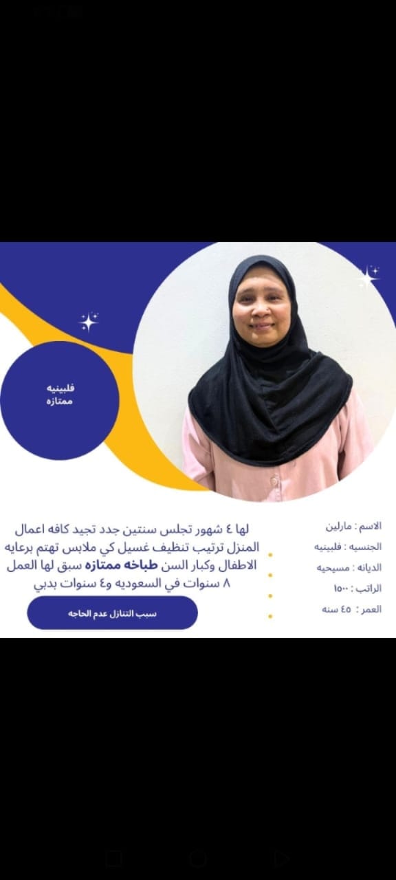 ✨ فلبيـنية ممتازة متاحة للعمل ✨ 👩🦱 الاسم: ماري 🌍 الجنسية: فلبينية ✝️ الديانة: مسيحية 🎂 العمر: 46 سنة 💰 الراتب: 1500 🧹 الخبرات والمهارات: ✔️ لها شهرين تجلس ✔️ تجيد جميع أعمال المنزل ✔️ ترتيب – تنظيف – غسيل…