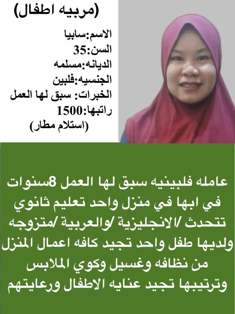 متوفر عماله منزليه وطباخات ومرافقين لكبار السن وعاملات نظافه ومربيات اطفال وكوافيرات وسائقين ومتاح التجربه لكل أنحاء المملكه والتجربة خير برهان 🇸🇦🇸🇦 تواصل علي الواتساب لإرسال السير الذاتيه واتساب 0578052462