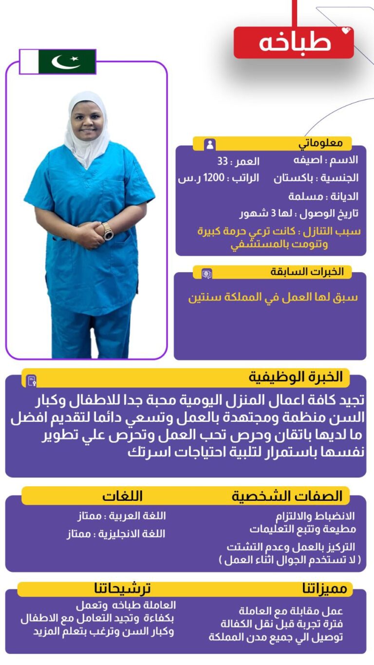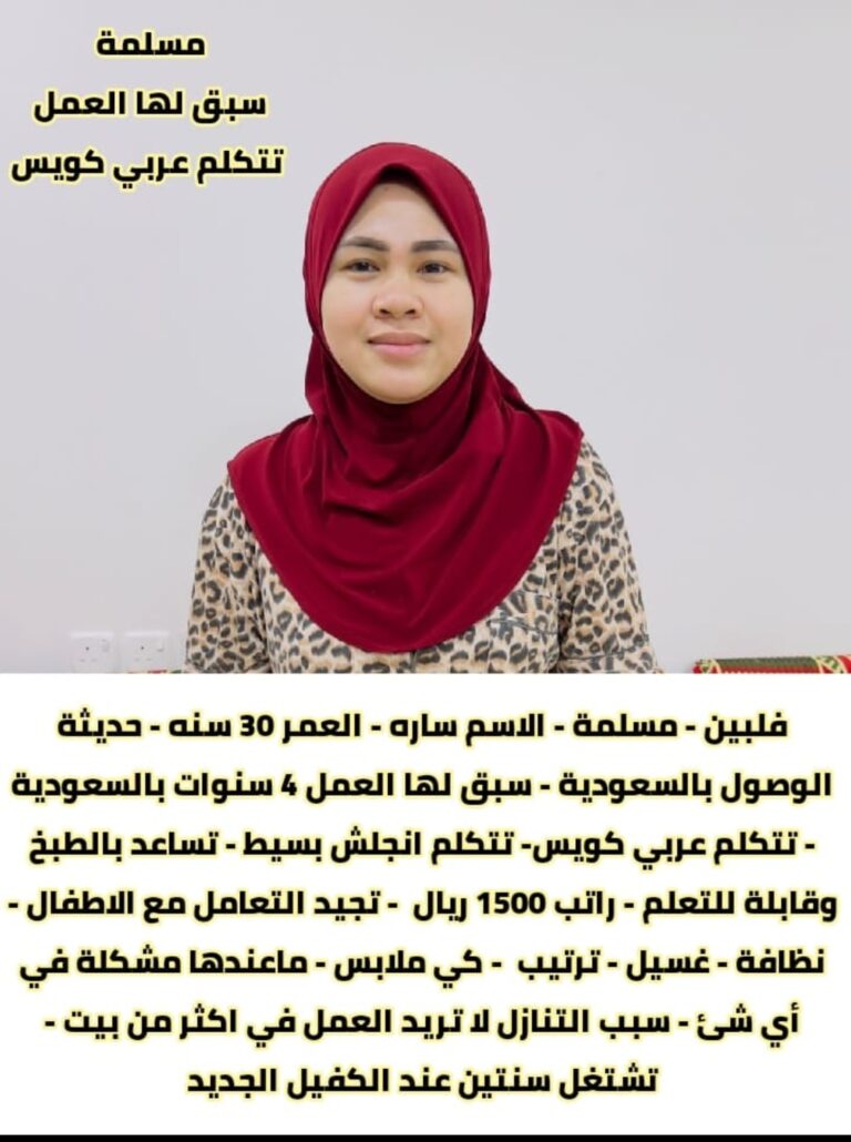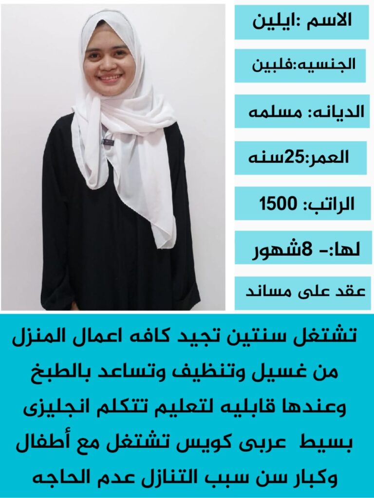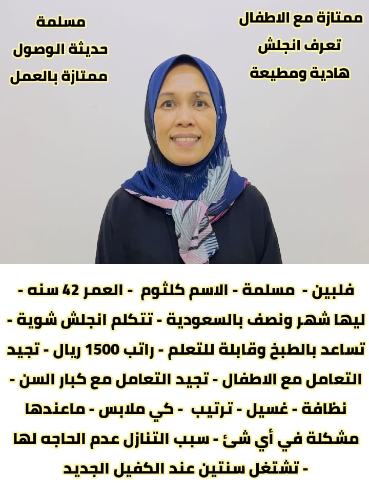 متوفر عماله منزليه وطباخات ومرافقين لكبار السن وعاملات نظافه ومربيات اطفال وكوافيرات وسائقين ومتاح التجربه لكل أنحاء المملكه والتجربة خير برهان 🇸🇦🇸🇦 تواصل علي الواتساب لإرسال السير الذاتيه واتساب 0578052462