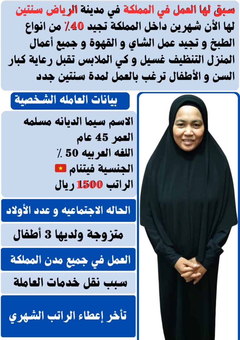 عملائنا الكرام… يوجد عاملات وطباخات للتنازل من جميع الجنسيات(اندونيسيا_فلبين_سيرلانكا_بنجلاديش_اثيوبيا_كينيا_اوغندا) مسلمات وغير مسلمات علي قدر كافي من المهاره والتدريب يجيدون الطبخ السعودي عاملات استلام فوري مع وجود فترة تجربه قبل نقل الكفاله نرسل عاملات لجميع أنحاء المملكه كما اعلن عن وجود…